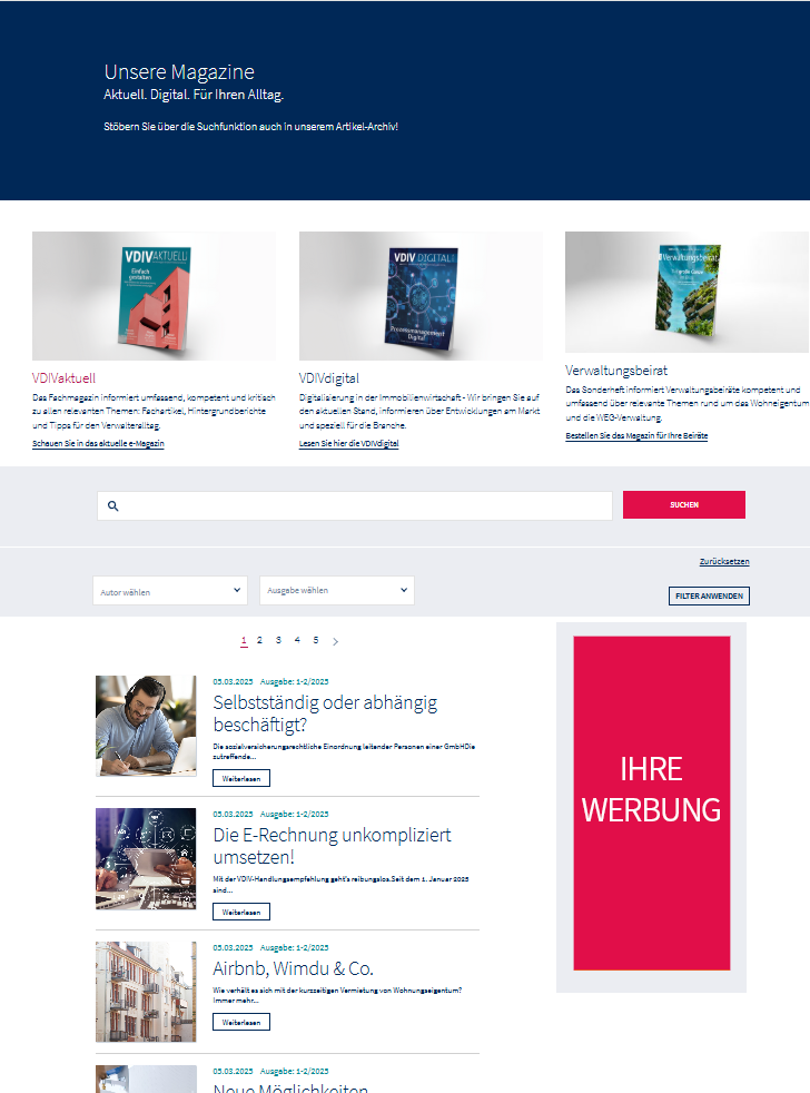 Schaffen Sie Sichtbarkeit und Aufmerksamkeit auf der Website des VDIV Deutschland mit einem exklusiven Skyscraper-Banner! Die Seiten zum Fachmagazin VDIVaktuell und dem VDIVaktuell-Archiv sind die am häufigsten gesuchten Webseiten auf vdiv.de – das ist Ihre Chance zur Werbung! Bannerformat: Wide Skyscraper (280 x 600 Pixel) Preis: 1.900 € pro Kalendermonat Kennenlernangebot: 14 Tage für 990 €Mit dem Banner sind Sie alleiniger Werbepartner auf der Seite vdiv.de/publikationen/magazine sowie auf allen Seiten der Archiv-Beiträge der VDIVaktuell.New Layer